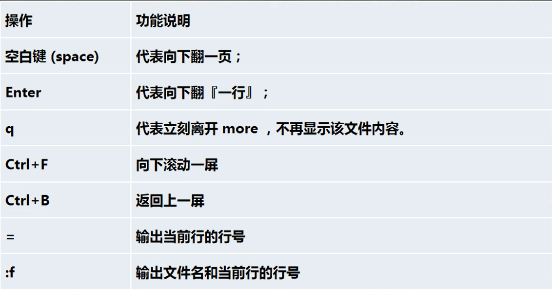 more指令 一个基于vi编辑器的文本过滤器,它以全屏的方式按页显示文本的内容,more指令内置的若干快捷键
